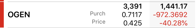 140 | OGEN | $0.71 | 3391 | $2,407.61 | 6000 | $0.42 | $2,520.00 | $4,927.61 | 9391 | $0.52 | 0 | 4CENT GAP |